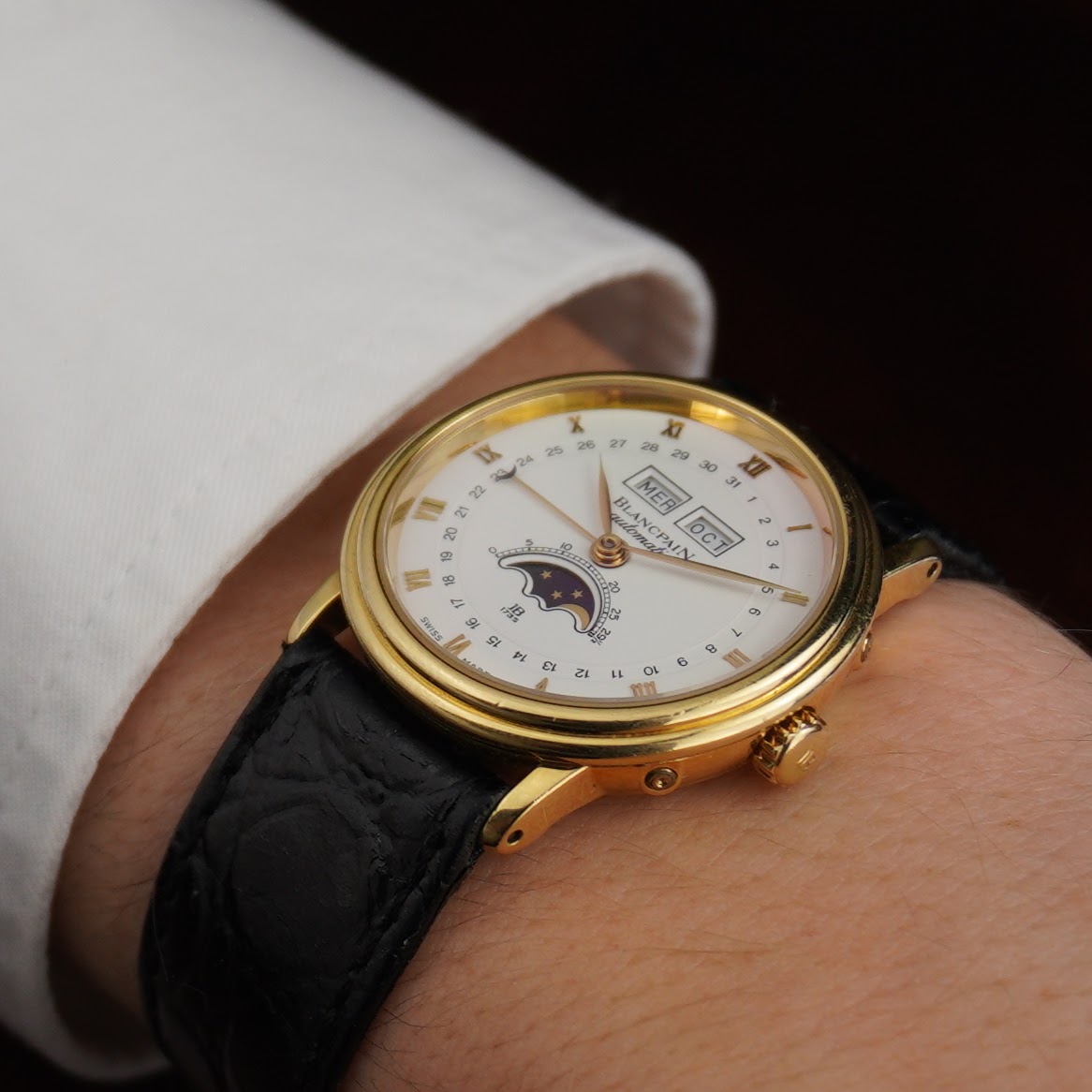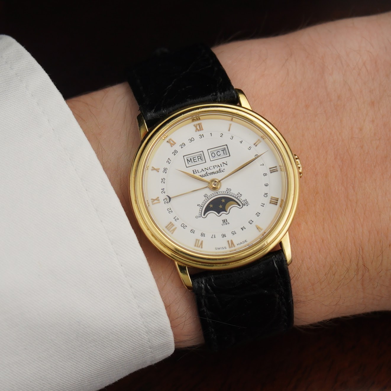 This particular Villeret model embodies the spirit of that revival complex, elegant, and understated. The medium-sized 34mm case ensures it wears beautifully on a wide range of wrists, and its automatic calendar moonphase movement is a testament to Blancpain’s mastery of traditional watchmaking.