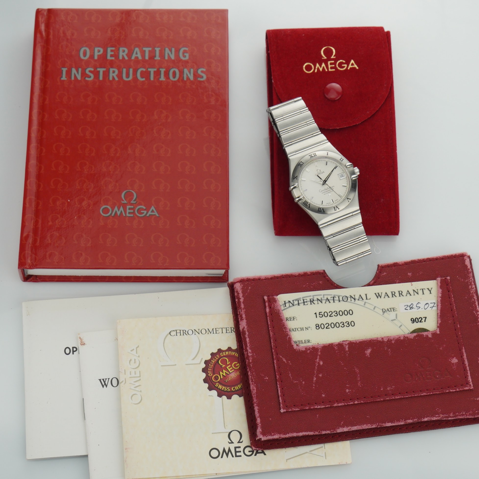 Additionally, the watch is accompanied by its original Omega warranty booklet, with warranty certificate and Omega watch pouch.